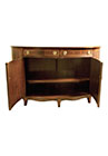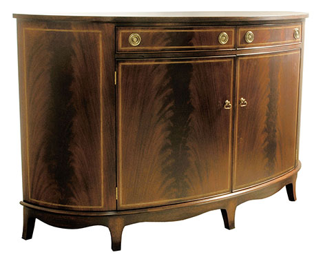 DESCRIPTION: Chest has mahogany and crotch mahogany veneer, 2 doors that open to an adjustable shelf, 2 silver partitioned drawers lined with Pacific cloth, a hepplewhite-like foot and solid brass hardware.