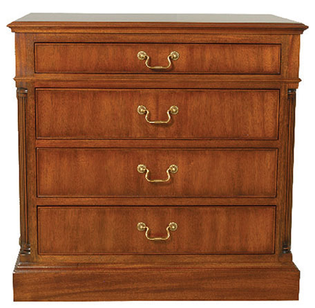 DESCRIPTION: Four drawers, panel moldings, fluted corner pilasters and type "A" solid brass hardware. Shown with optional ogee bracket base (plinth base standard). Mahogany and mahogany veneer. Available with optional olive burl veneer. Shown with optional rosettes.