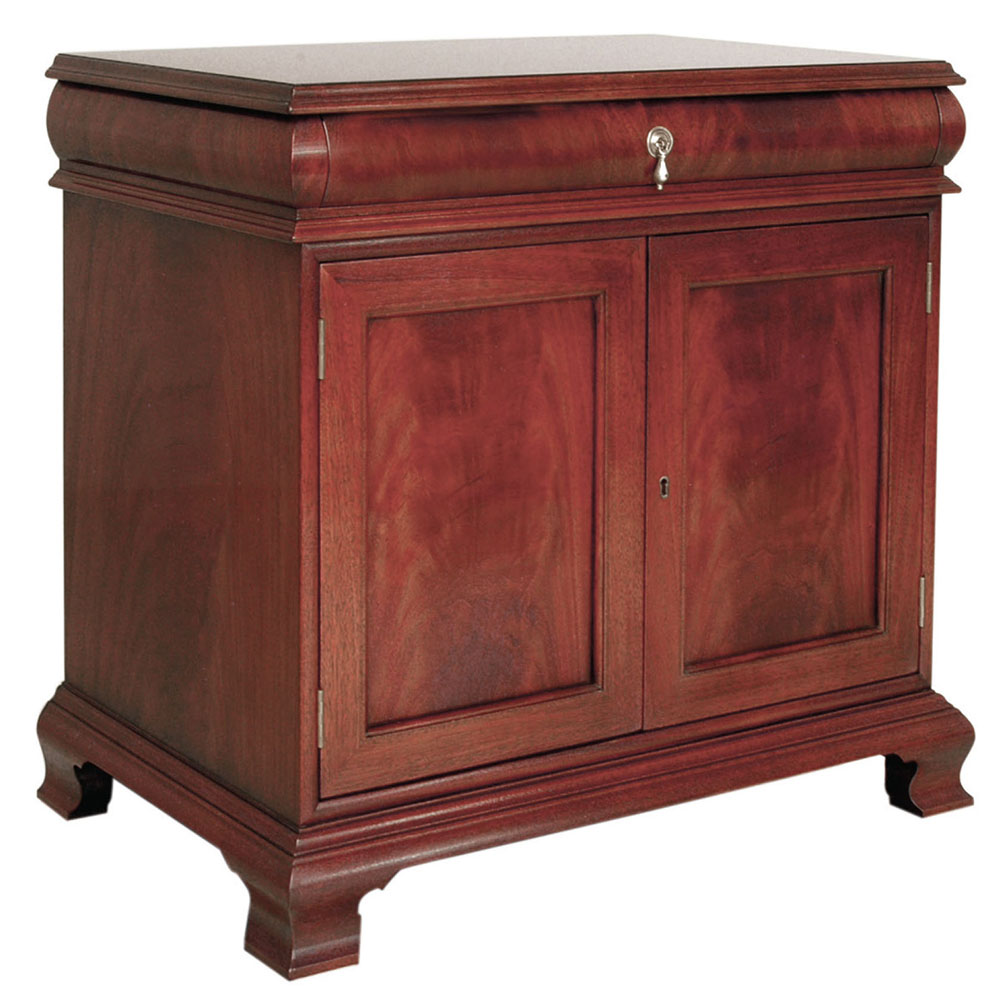 DESCRIPTION: Double door unit with top drawer;one adjustable shelf inside. Mahogany and crotch mahogany veneer; ogee bracket base; walnut herringbone inlay around doors. Solid brass hardware.