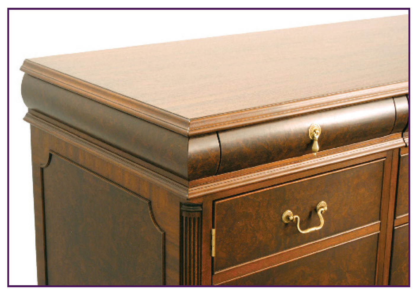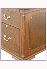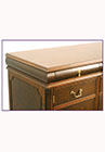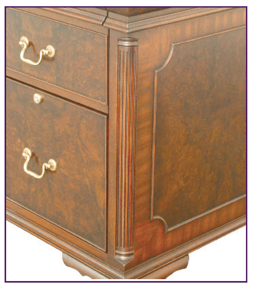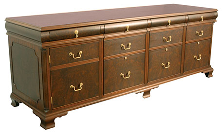 DESCRIPTION: Credenza has walnut burl veneer, panel molding and corner pilasters. The working drawer sits above a door that opens to a pullout shelf for a printer. The remaining drawer fronts are simulated and pull out to reveal file storage with locking lower units. A grommet is conveniently located on back panel of door unit and all hardware is solid brass.