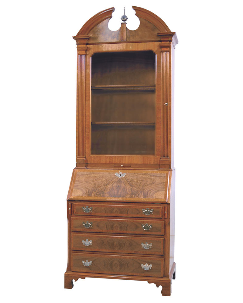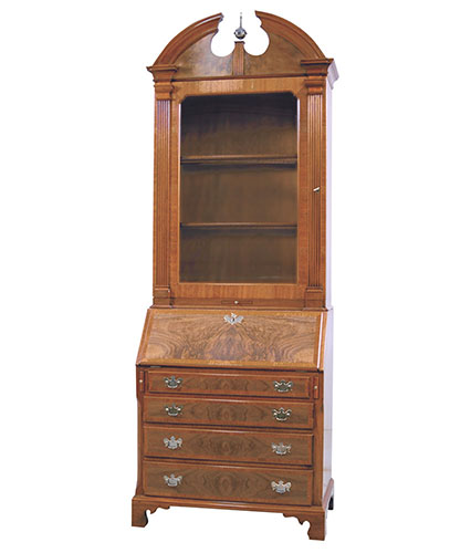 DESCRIPTION: Mahogany and mahogany veneer secretary bookcase has heavily figured walnut veneer and broken pediment rests on fluted pilasters. The upper section has candle slide, beveled glass door with lock, two framed-in glass shelves and interior lighting with dimmer. Drop lid writing surface reveals pigeon holes, four drawers flanking center door with pillars. Four graduated drawers with walnut field banded by mahogany. Bookcase is completed with bracket feet and solid brass hardware.
