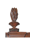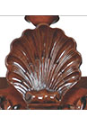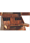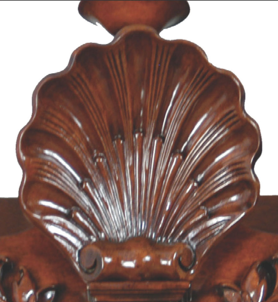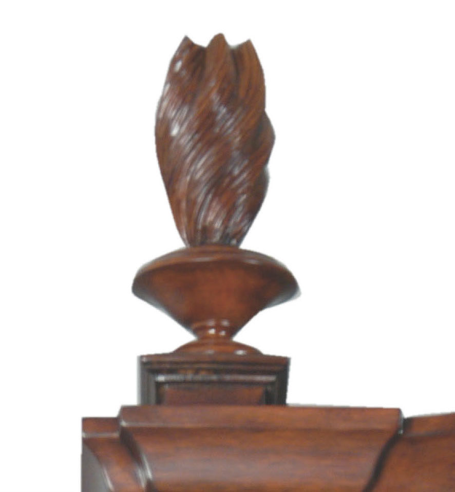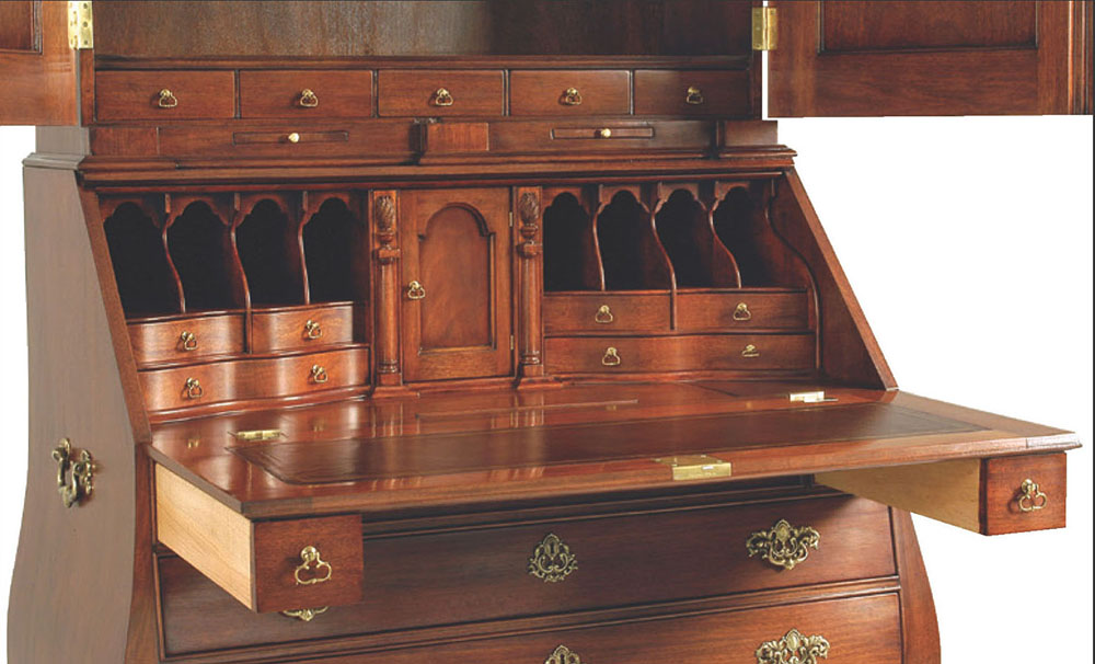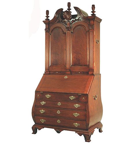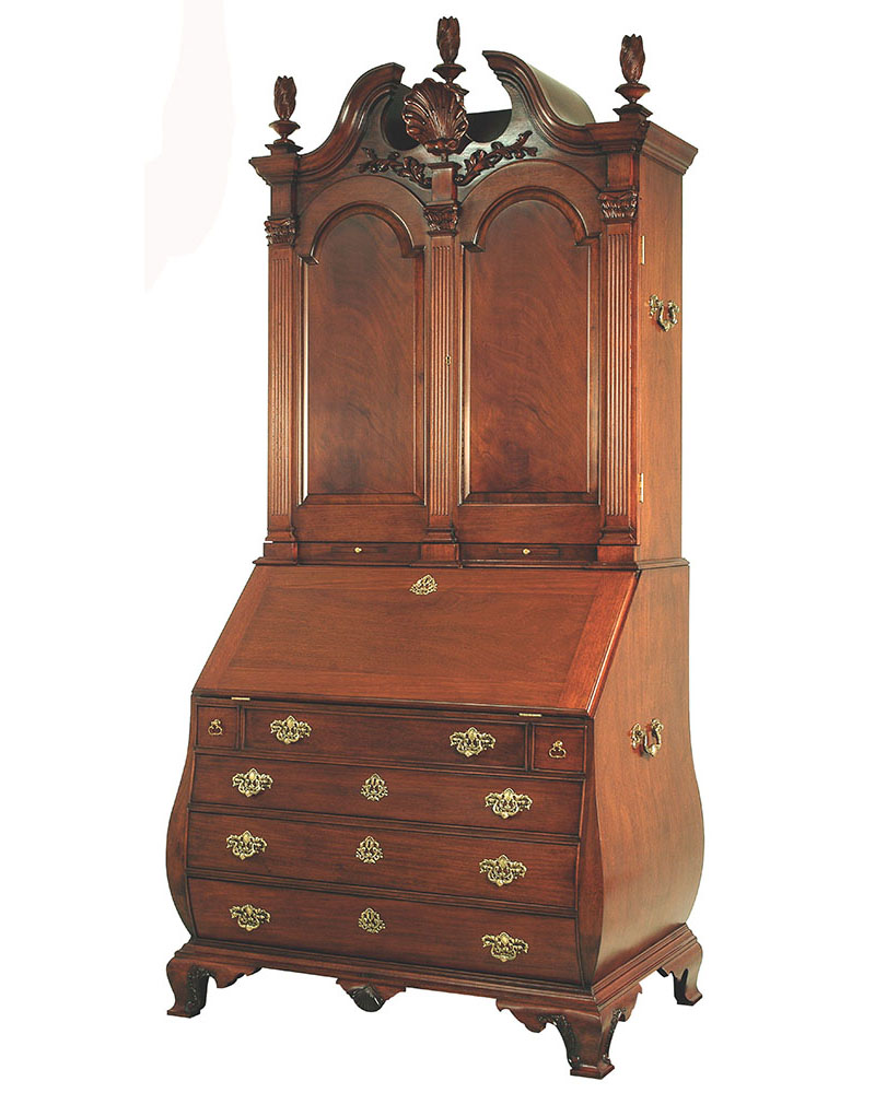 DESCRIPTION: Mahogany and mahogany veneer secretary cabinet features Bombé styling and intricately carved details. This cabinet has a hooded bonnet top with swan neck pediment and center carved shell ornament, carved Corinthian capitols, pilasters and torch finials and carved foliage on the front and side of ogee bracketed feet. A drop-lid tooled-leather writing surface reveals stepped serpentine pigeon holes and drawers with shaped partitions. Four drawers beneath the writing surface have solid brass “Rococo” drawer pulls and keyhole embellishments.