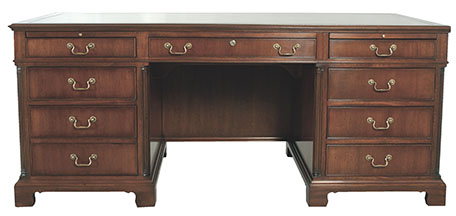 DESCRIPTION: 72” mahogany and mahogany veneer desk is standard with modesty panel, panel moldings, pencil tray in center drawer, central locking device, writing board above top drawers, two deep file drawers, fluted corner pilasters, and solid brass hardware.