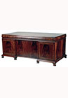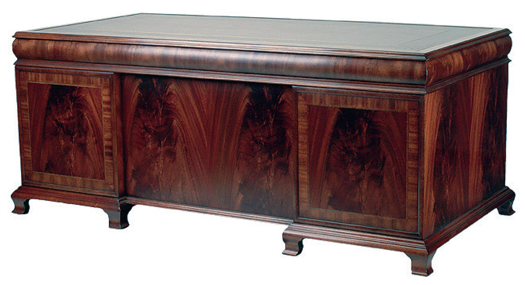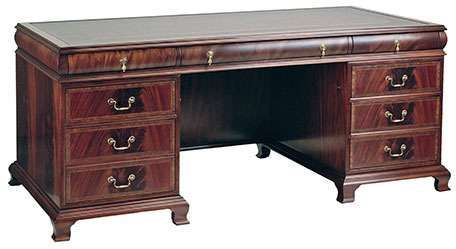 DESCRIPTION: 72” mahogany and crotch mahogany veneer desk has drop pendant style drawer pulls on top, solid brass bail pulls on bottom drawers, pencil tray in center drawer, and two deep file drawers. Desk has ogee bracket feet and available with optional leather top.