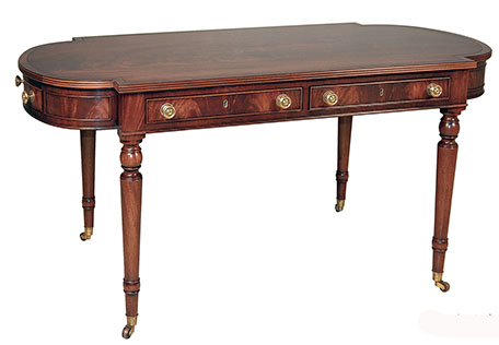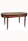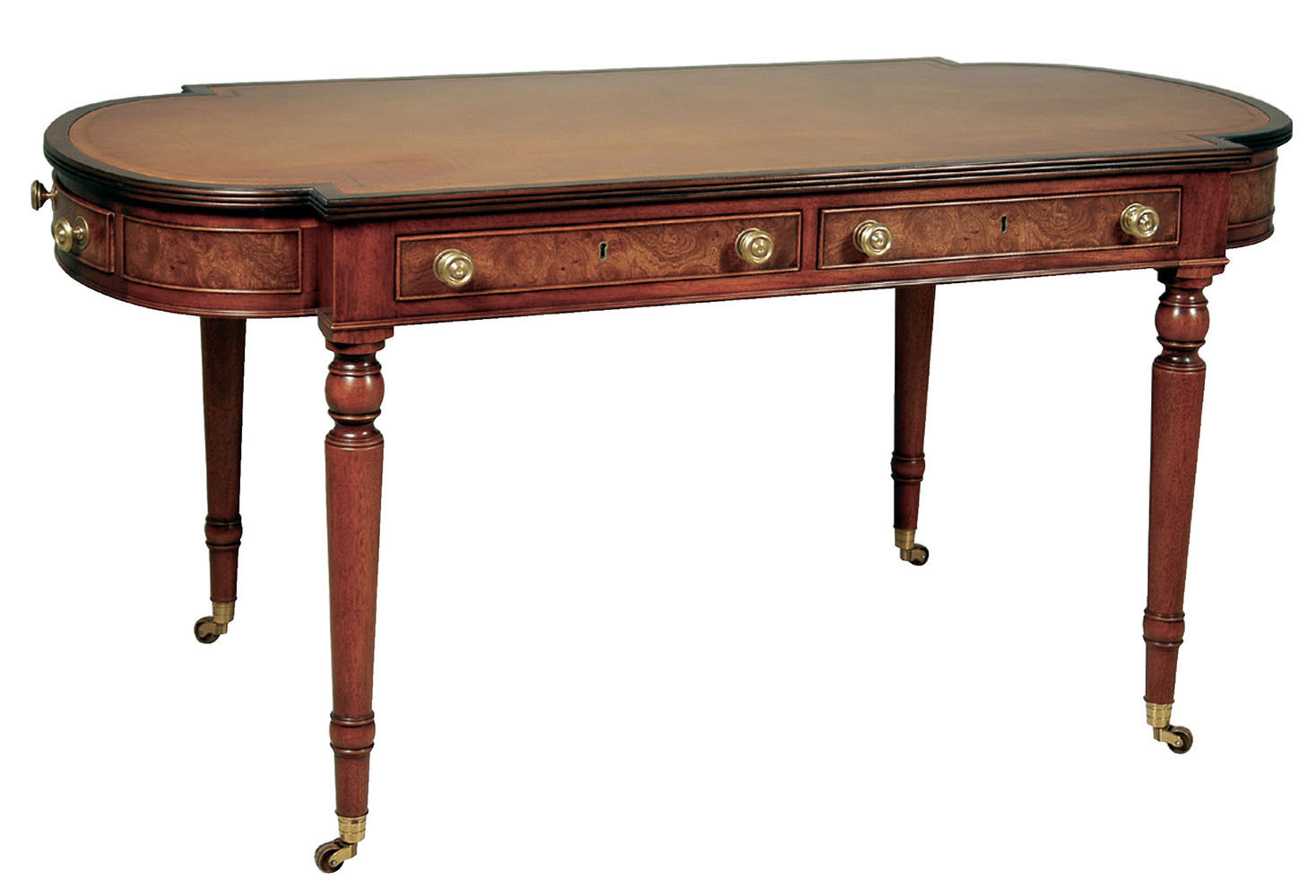 DESCRIPTION: 62” mahogany and mahogany veneer table desk has mahogany banded border on top, two drawers with locks on both front and back, one drawer at each end, solid brass hardware and casters. Available with optional crotch mahogany, olive ash burl and a leather top.