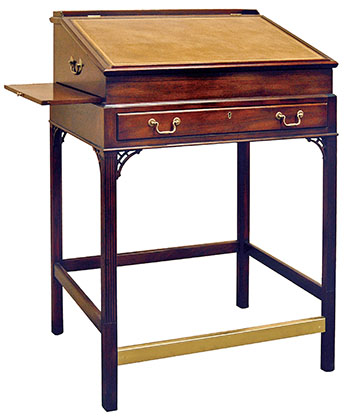 DESCRIPTION: Mahogany and mahogany veneer stand-up desk has locking drawer, pierced brackets, fluted legs, brass kick plate on lower stretcher and solid brass hardware. Available with leather or wood top and optional pull-out slides on ends. Please specify height to floor at elbow rest (40-46”).