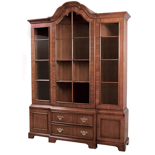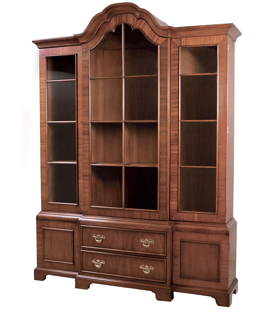 DESCRIPTION: This mahogany and mahogany veneer display case has two adjustable shelves and one stationary shelve in each upper section. Lower section features two center drawers, two locking end doors and solid brass hardware. Available with optional interior lighting.