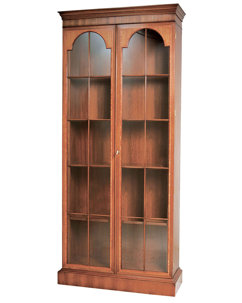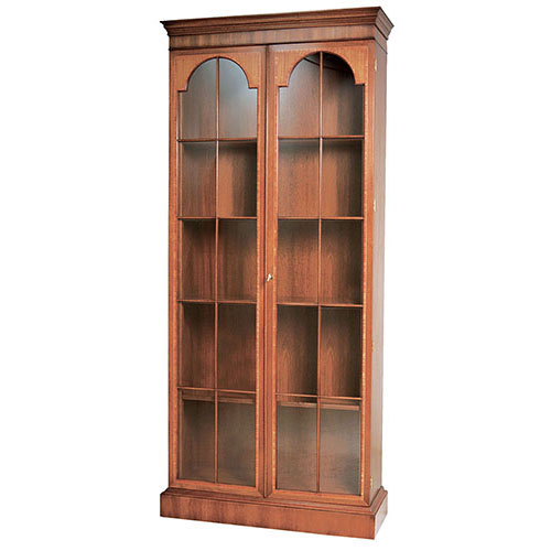 DESCRIPTION: This mahogany and mahogany veneer cabinet’s locking doors feature satinwood, tulipwood and boxwood inlay. The interior has three adjustable shelves, one stationary shelf and is available with optional lighting.