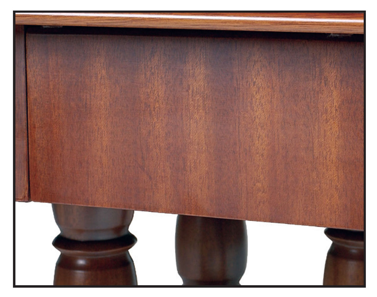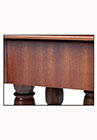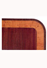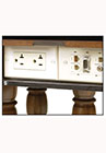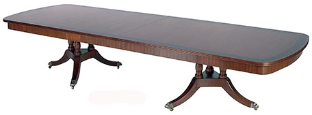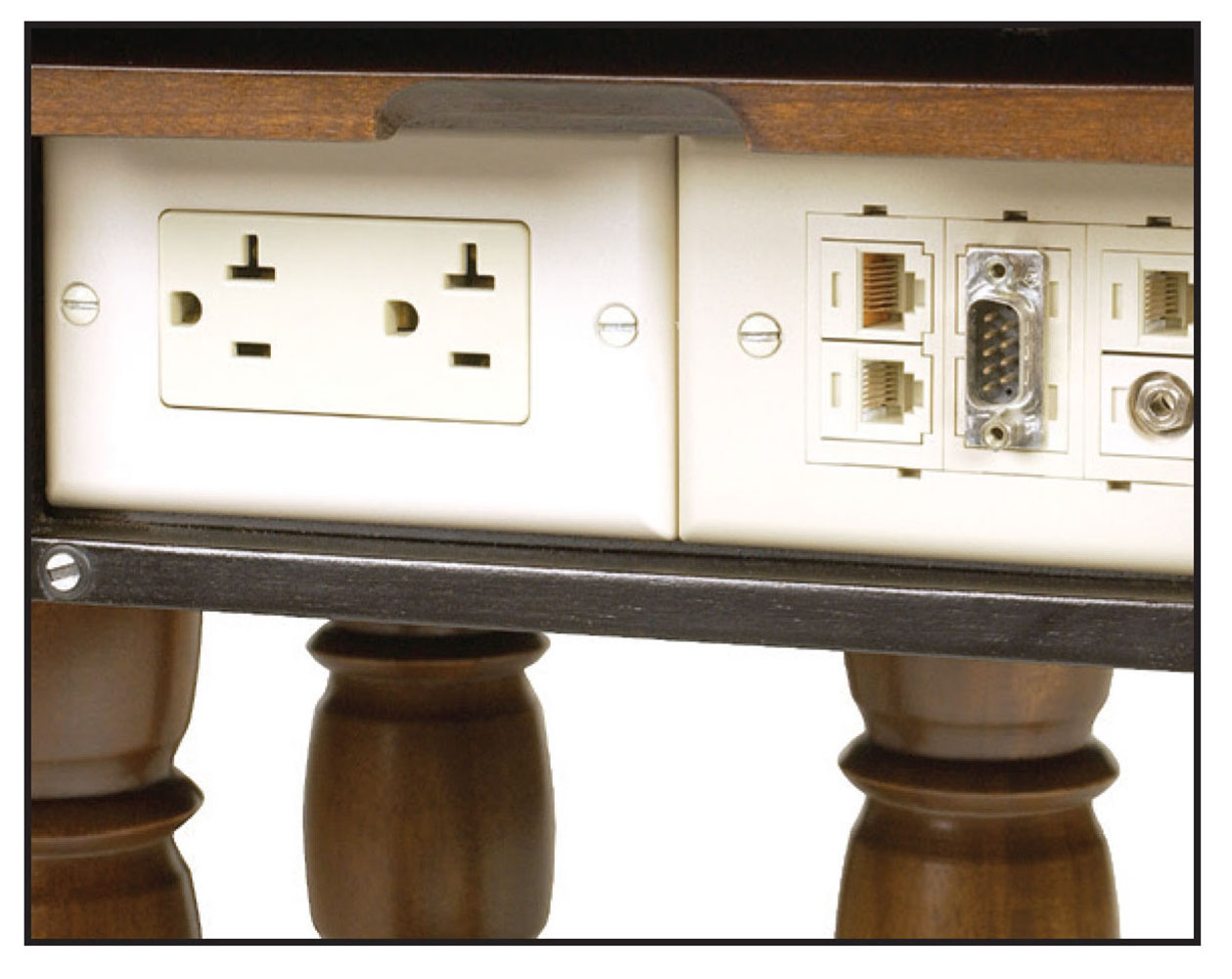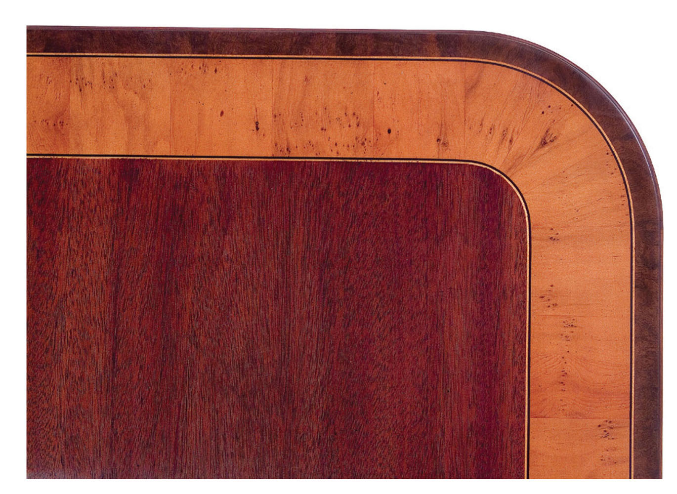 DESCRIPTION: Custom rectangular mahogany and mahogany veneered table has D–shape corners. The mahogany field and the rosewood and walnut burl banded top are separated by boxwood and ebony inlays. Power/data/communication ports are hidden in the apron by a sliding door. The (2) KT 8506 bases have solid brass lion toe caps with casters.