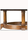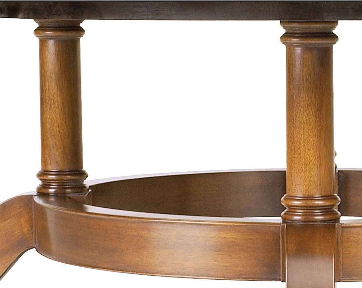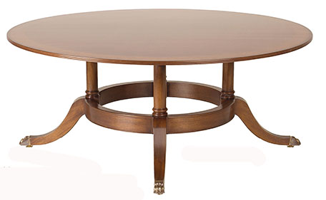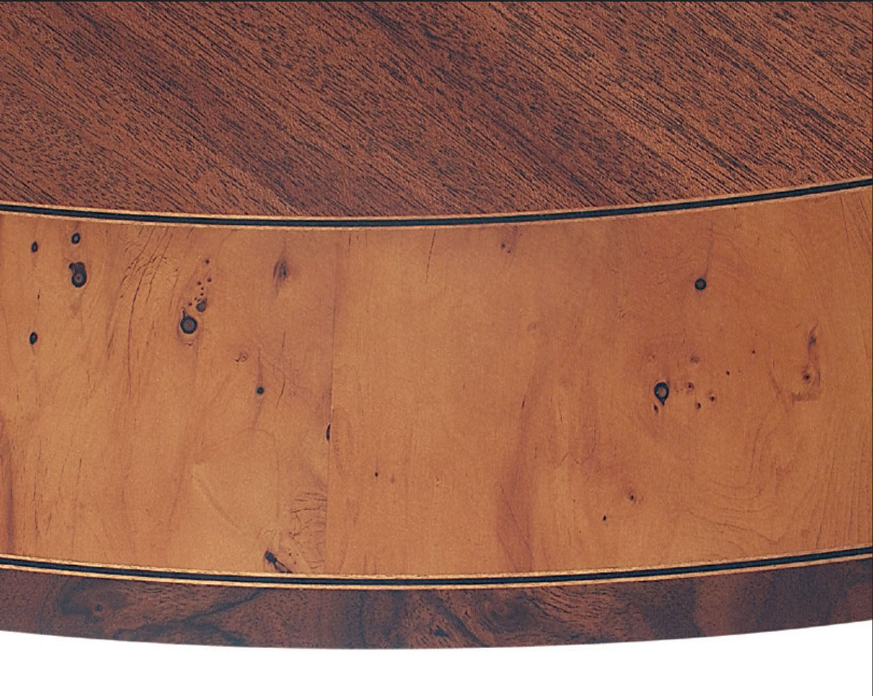 DESCRIPTION: Custom 84” round table has a mahogany field and yewwood banding separated by boxwood/ebony/boxwood inlays with an outer banding of walnut burl. The custom ring base has solid brass lion claw toe caps.