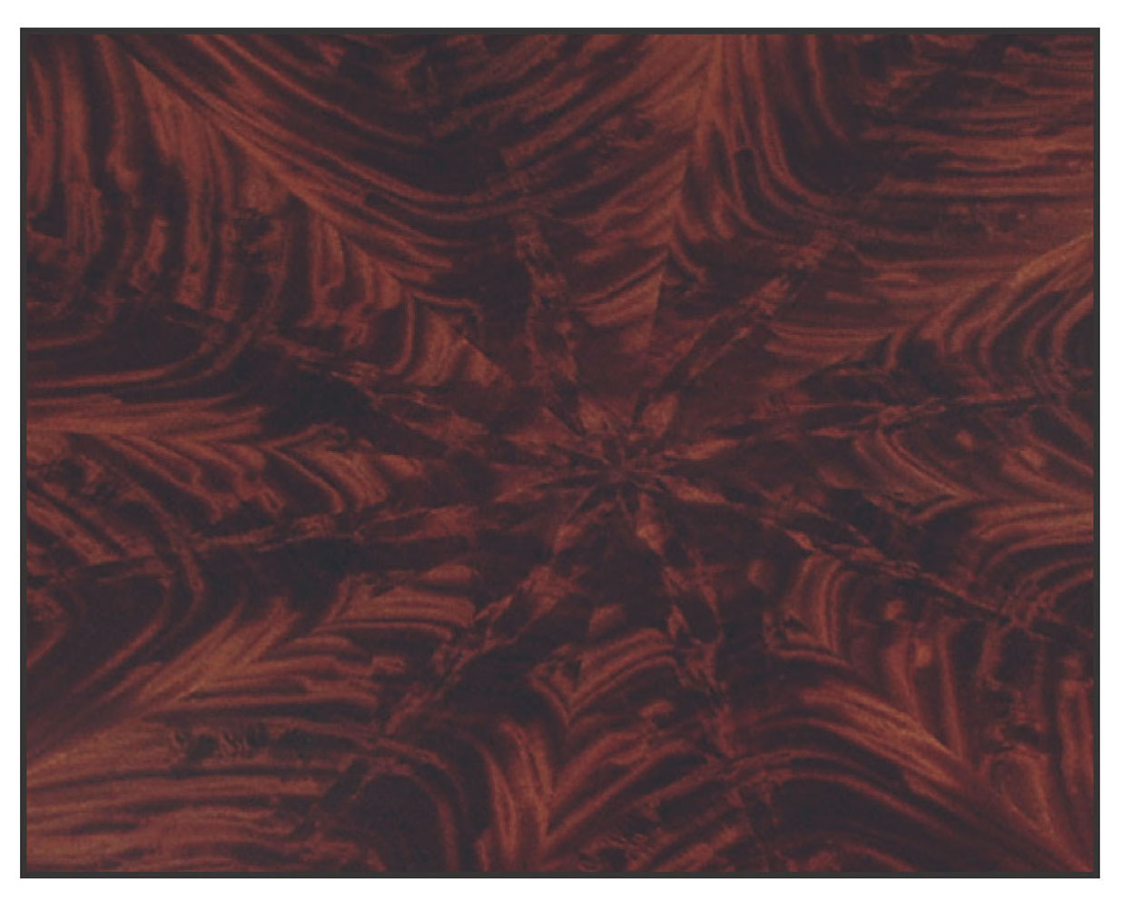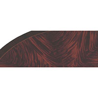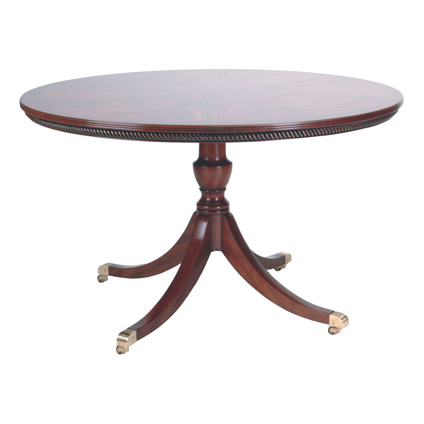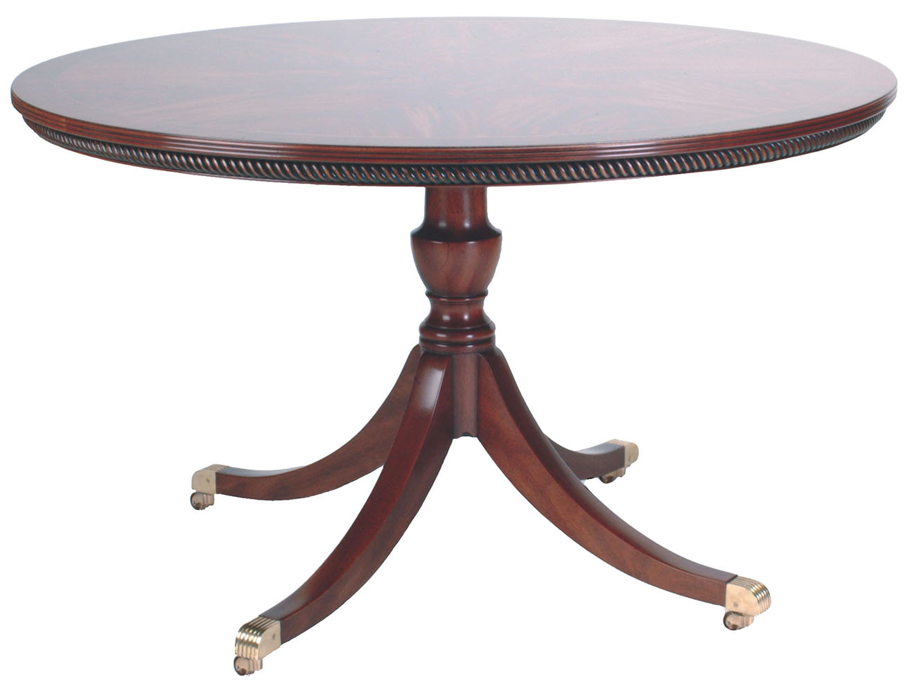 DESCRIPTION: Custom 48” round table is highlighted by a sunburst radial match within the crotch mahogany field. Separating this field and the rosewood banding is an ebony/boxwood inlay. Table is completed by a reeded edge with rope molding and a KT 8603 four–sweep base with polished reeded brass casters.
