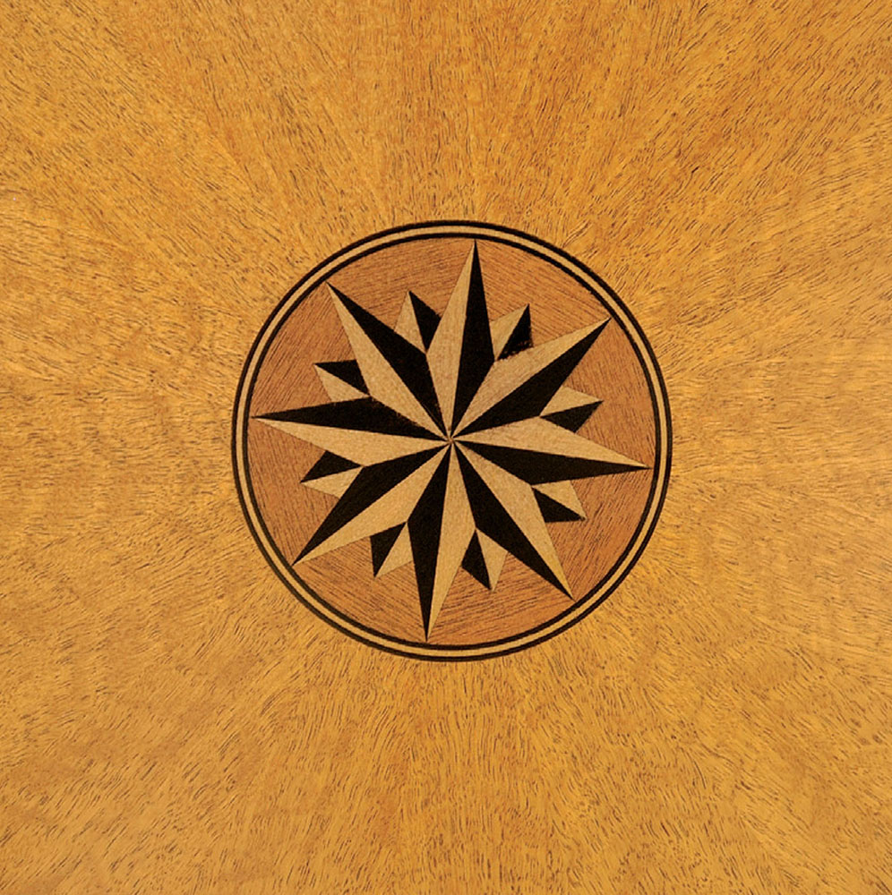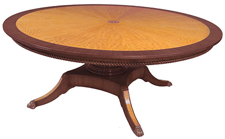 DESCRIPTION: Custom 84” round center table’s highlight is the compass rose in the center. A Movingui satinwood radial matched field and the ribbon cut mahogany banding are separated by a boxwood and ebony inlay. The Mahogany base has satinwood on top of all four legs.