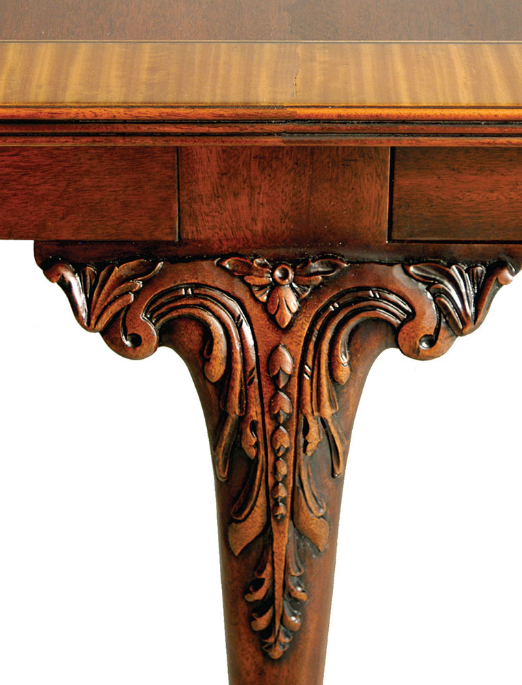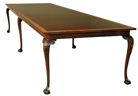 DESCRIPTION: Custom rectangular conference table has a mahogany field and a satinwood band with a reeded edge. The 3” apron is supported by cabriole legs accented with leaf carving on the knees, and claw and ball feet.