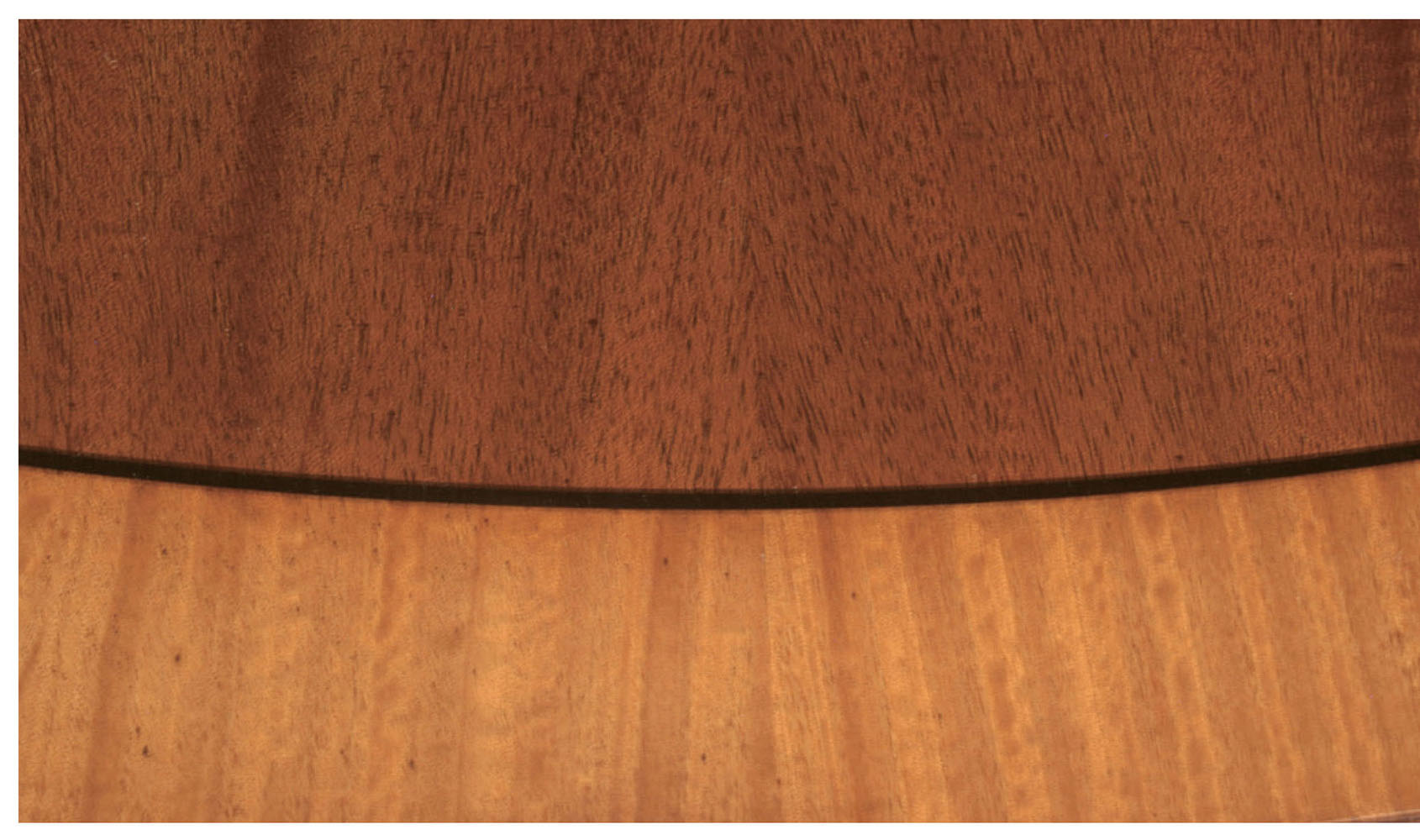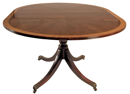 DESCRIPTION: Custom mahogany table’s radial match crotch mahogany field and single satinwood band are separated by an ebony inlay and completed with a reeded edge. (1) 18” leaf is included. Table shown with a KT 8603 four–sweep base with solid brass casters.