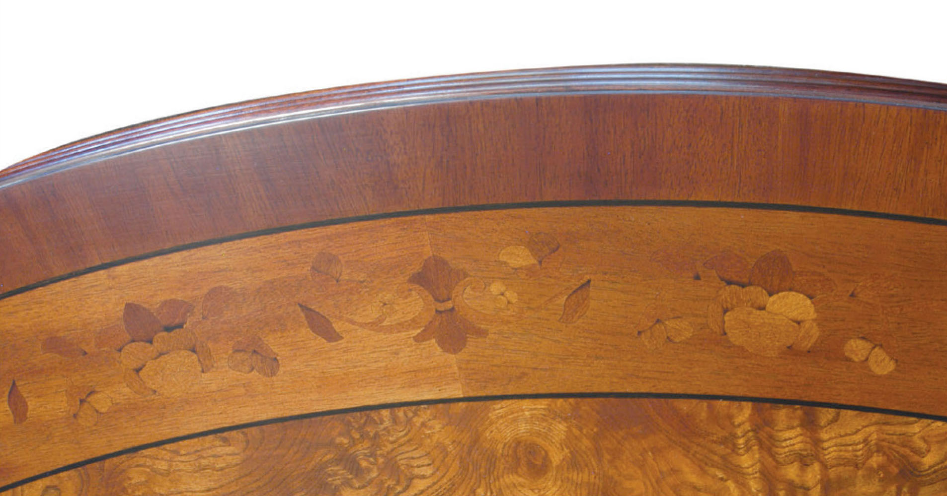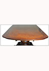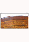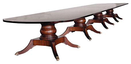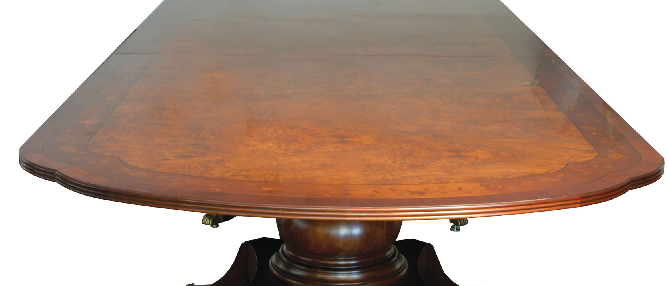 DESCRIPTION: Rectangular four–piece top conference table has notched “D” ends. The olive burl field and 2” ribbon mahogany banding are separated by an ebony inlay 4” marquetry pattern, and completed with a reeded edge. Table shown with a KT 8610 four–sweep base with solid brass lion paw toe caps and olive ash burl inlay on sweeps.