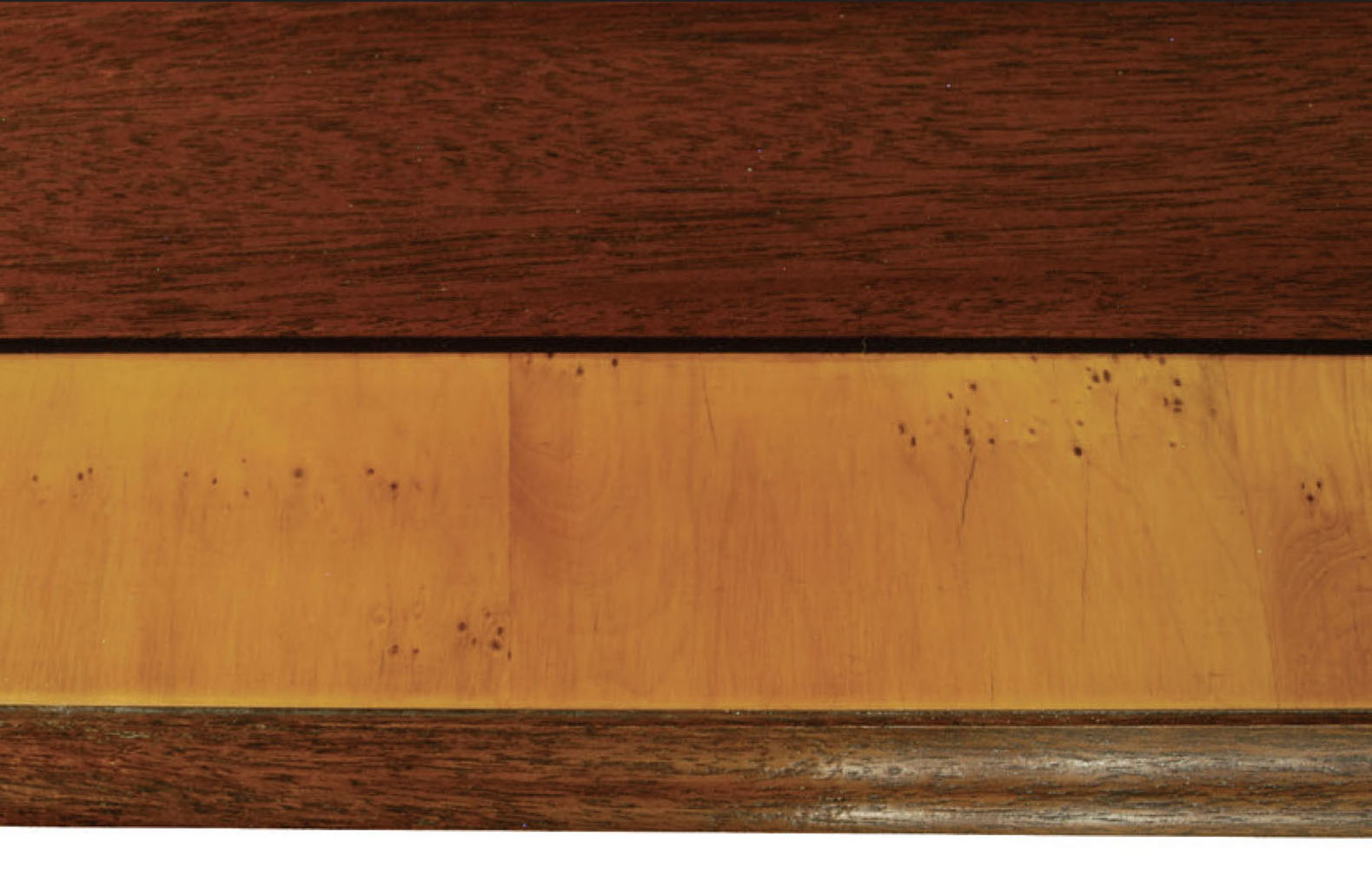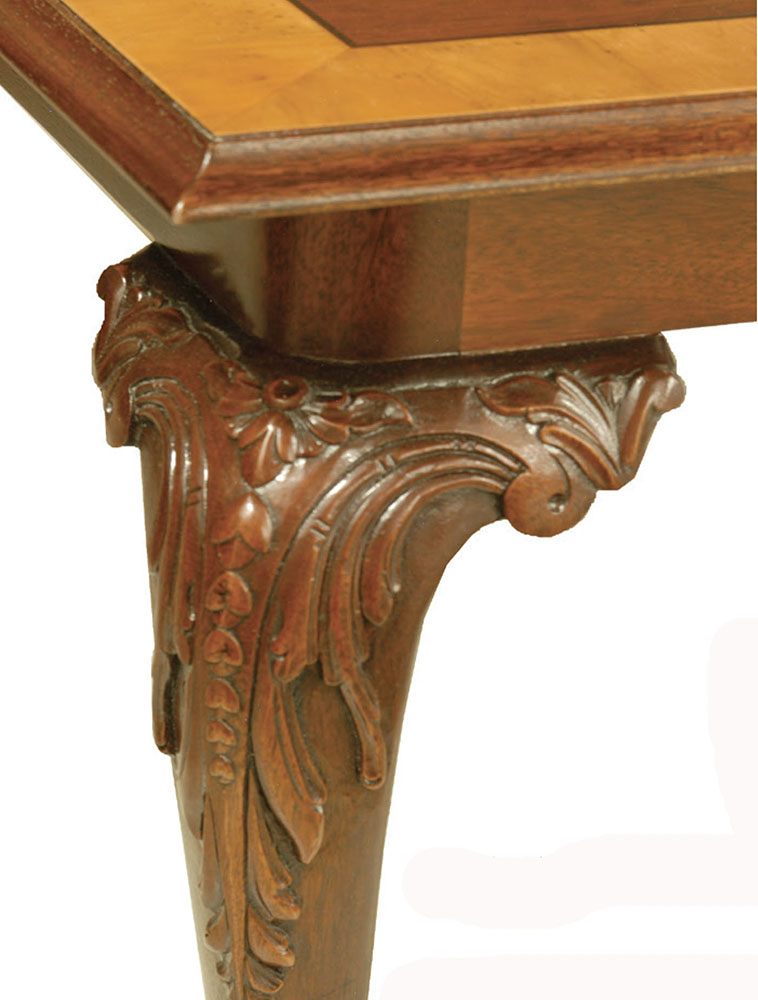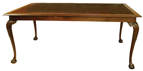 DESCRIPTION: Rectangle mahogany conference table with yewwood banding separated by an ebony inlay and completed with an ogee molded edge. Each cabriole leg has a leaf carving on the knee, atop a ball and claw foot.