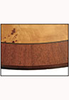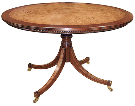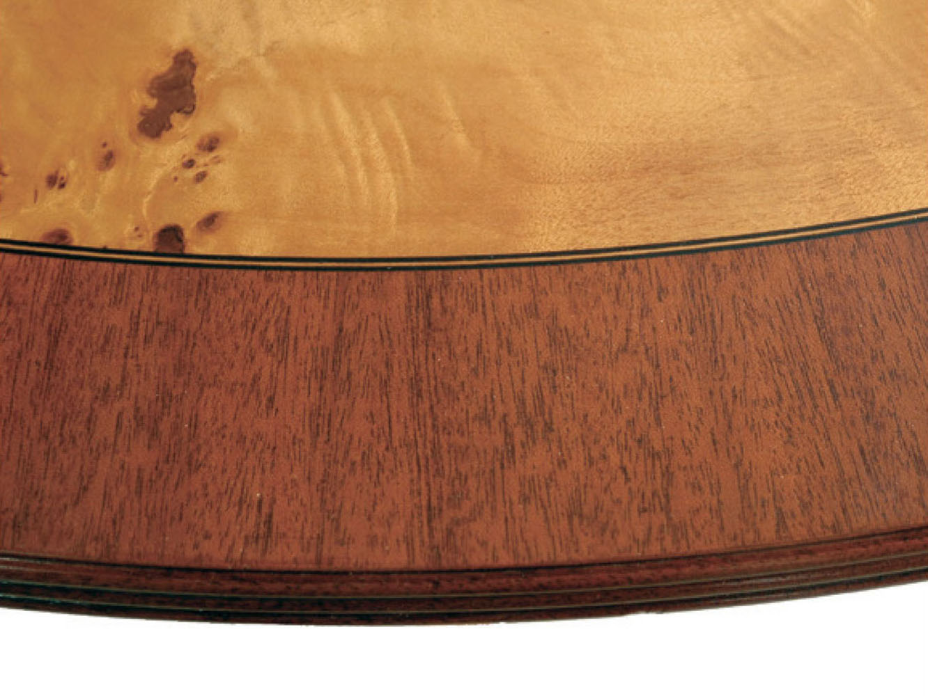 DESCRIPTION: Center table has a mappa burl field and a ribbon mahogany band separated by ebony/boxwood/ebony inlay. Table is shown with a reeded edge and rope molding detail below the top. The KT 8611 four–sweep base has mappa burl inlay on all legs.