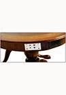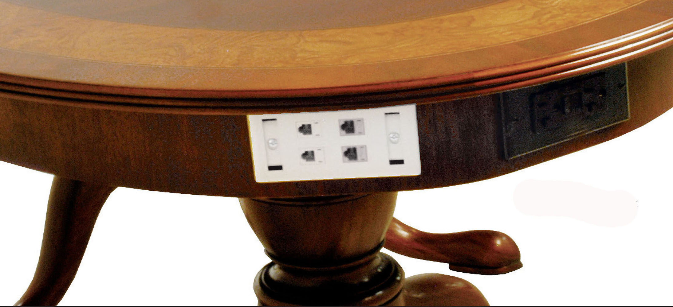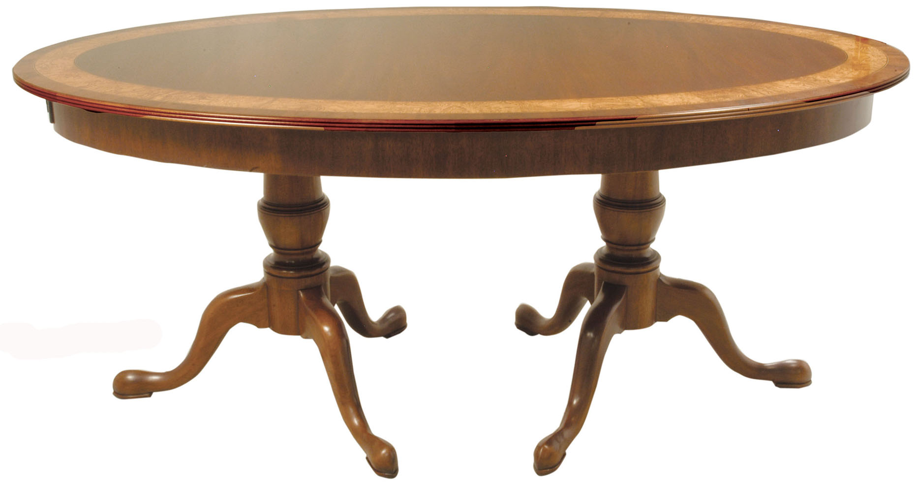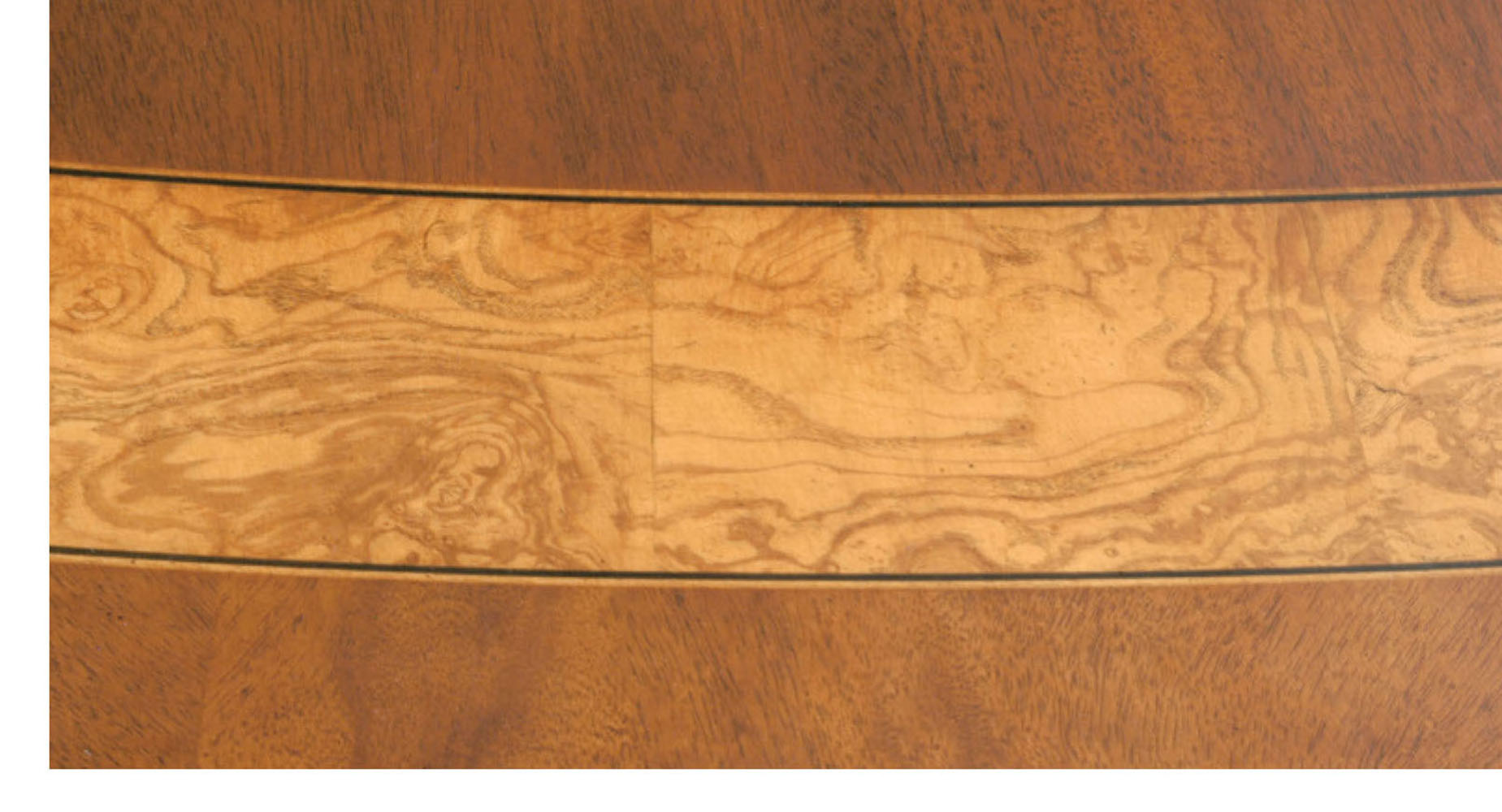 DESCRIPTION: Conference table with “D” corners has an olive ash burl field and a mahogany band separated by ebony/boxwood inlay. Optional apron shown with waterfall ribbon cut mahogany. The (2) KT 8610 four–sweep bases have solid brass lion claw toe caps.