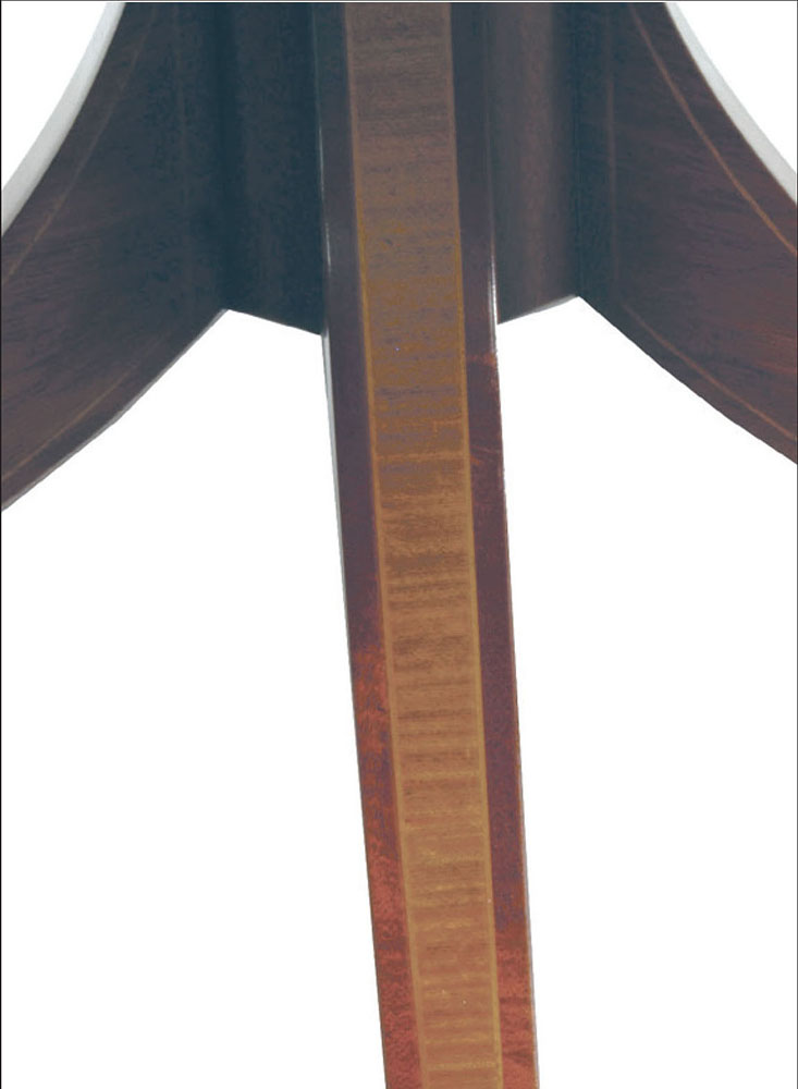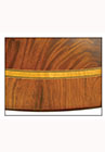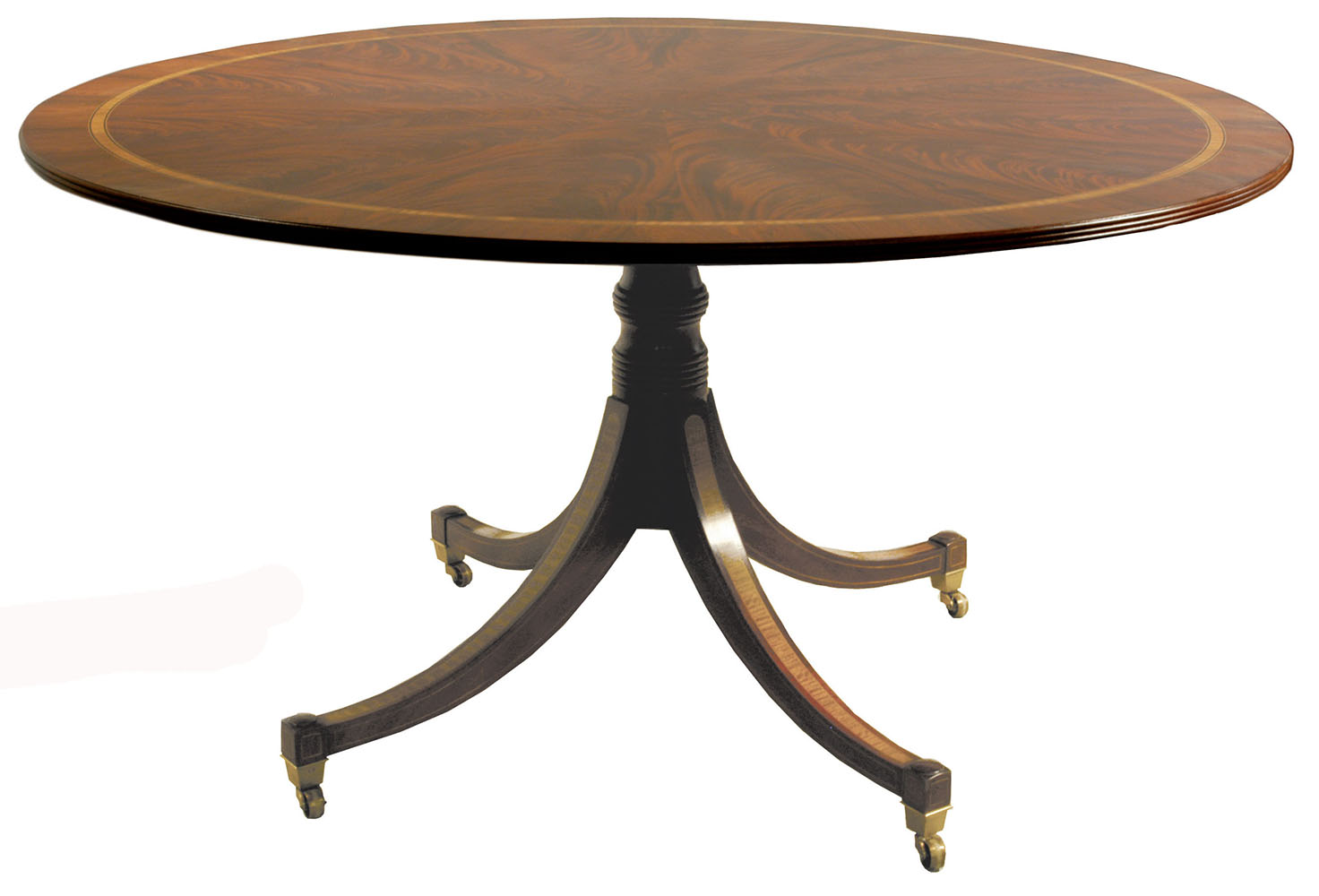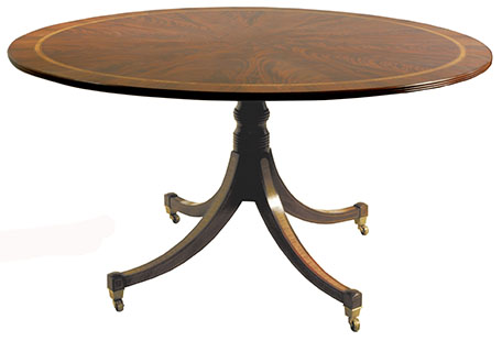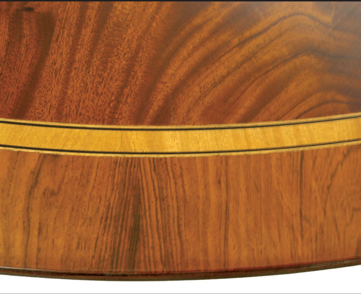 DESCRIPTION: Round crotch mahogany radial matched center table and the mahogany banding are separated by a boxwood/ebony/satinwood /ebony/boxwood inlay. The KT 8611 base has satinwood inlays and solid brass casters.