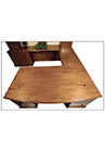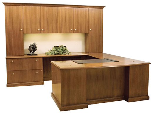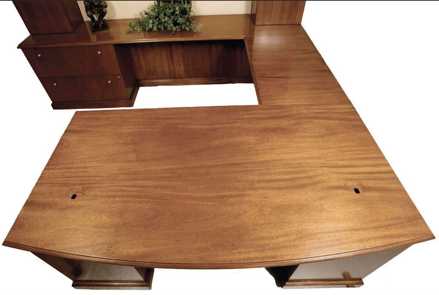 DESCRIPTION: Part of the Evolution Collection, this executive quartered figured mahogany workstation’s “U” configuration, has a tack board constructed upper credenza with four European hinged doors that open to one adjustable shelf, task lighting underneath and end cabinet units. The lower credenza has two 36” box/box file drawers. When bought as a unit, the Evolution mahogany desk has solid oak drawer sides, locking desk pedestal, matching wood grain grommet cover and a center drawer that opens to reveal a pencil tray. All hardware is solid brass.