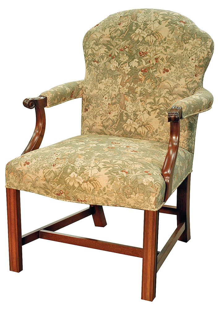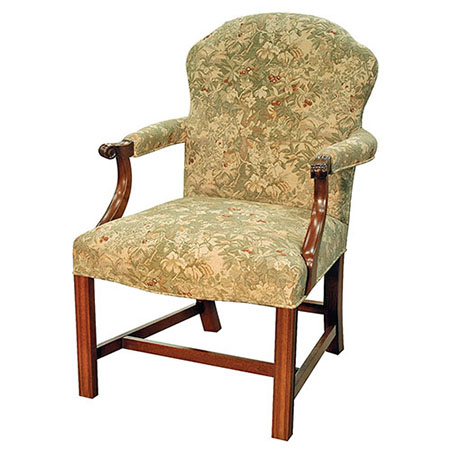 DESCRIPTION: Mahogany Chippendale chair has curved crest rail and serpentine seat, carved and shaped arm hand holds, standard welt trim with fabric. Available with optional full nail trim.