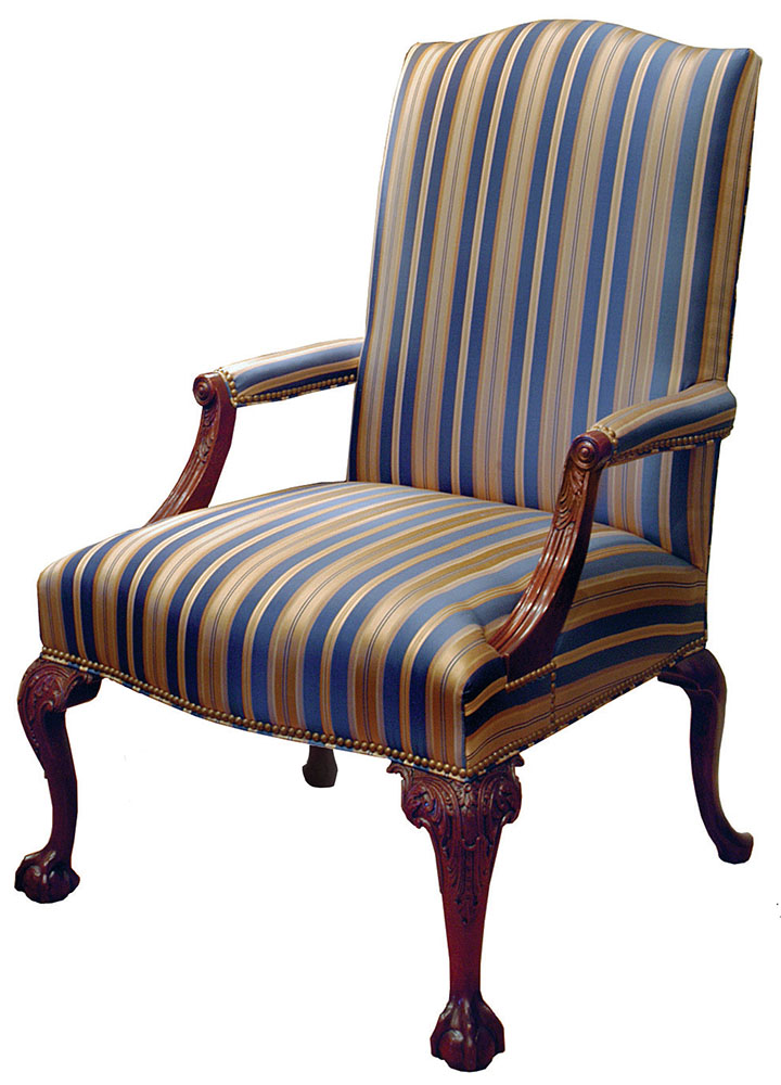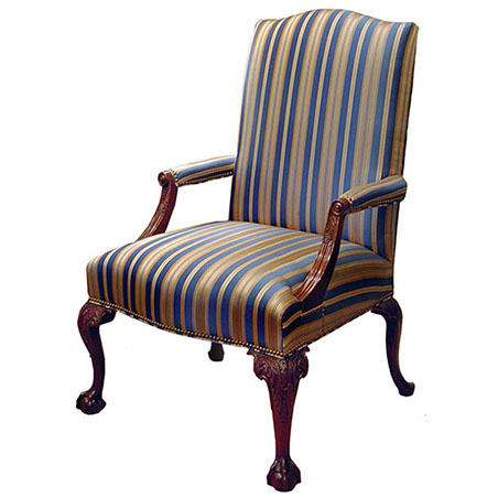 DESCRIPTION: Mahogany library chair has carved and shaped open arms, front cabriole legs with carving on knees and claw-and-ball feet.