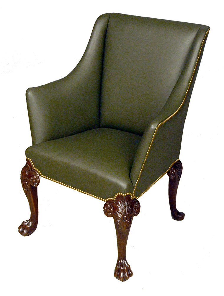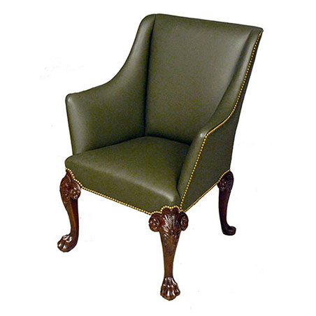 DESCRIPTION: English Chippendale chair with leaf carving on knee of front and rear, carved rosettes on legs and lion’s paw foot. Leather receives full nail trim.