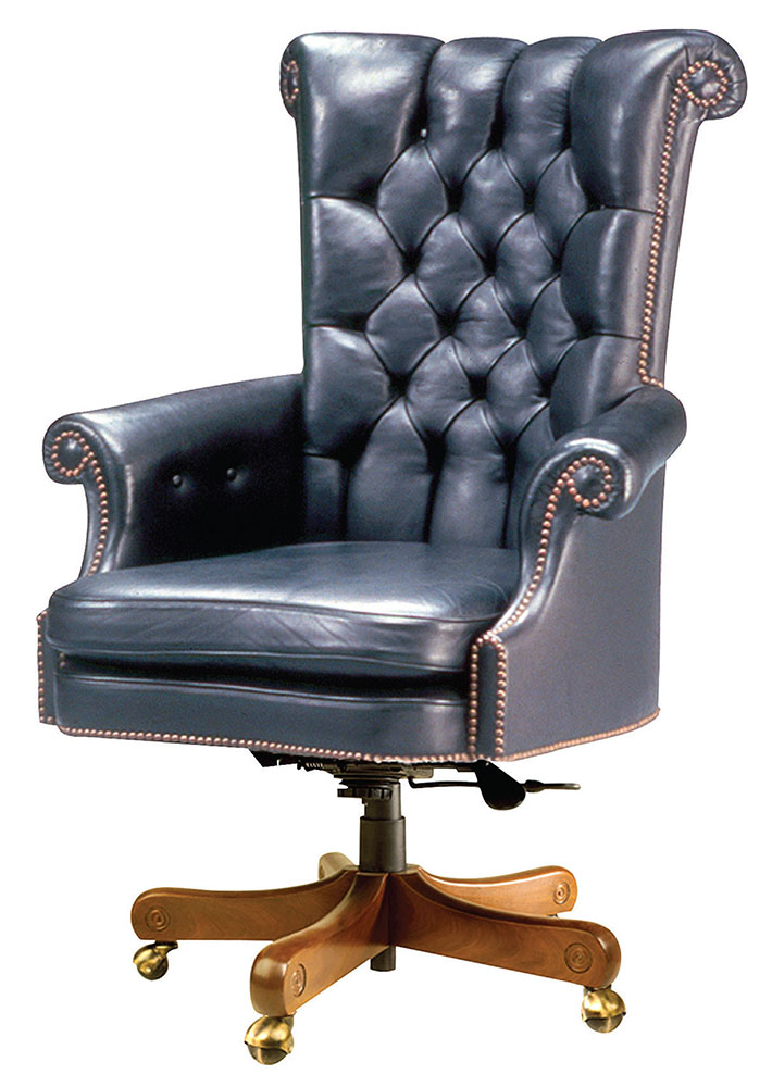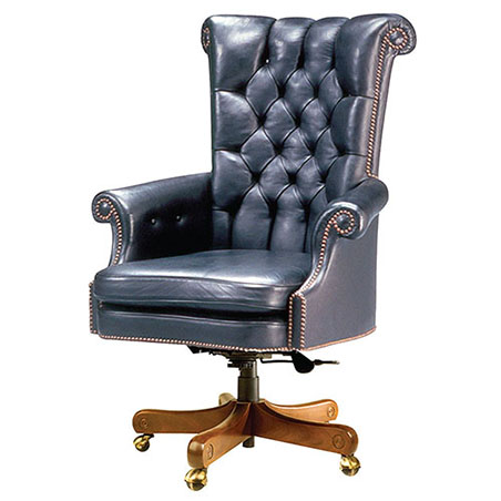 DESCRIPTION: Mahogany executive swivel chair has a loose seat cushion, standard diamond tuffed back and leather cover receives full nail trim. KS3490 adjustable 5-star mahogany base has a height adjustment of 5”.