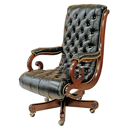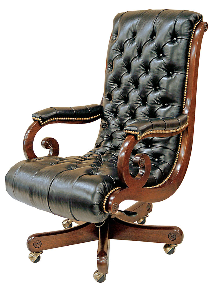 DESCRIPTION: Diamond tufted swivel chair leather cover receives full nail trim. KS3490 adjustable 5-star mahogany base has a height adjustment of 5”.