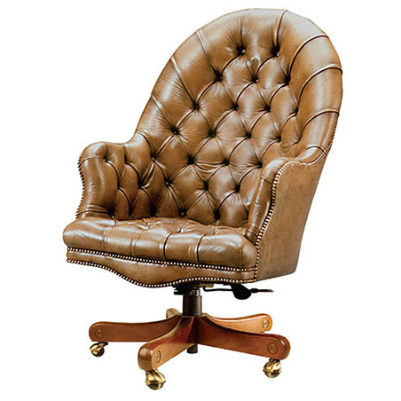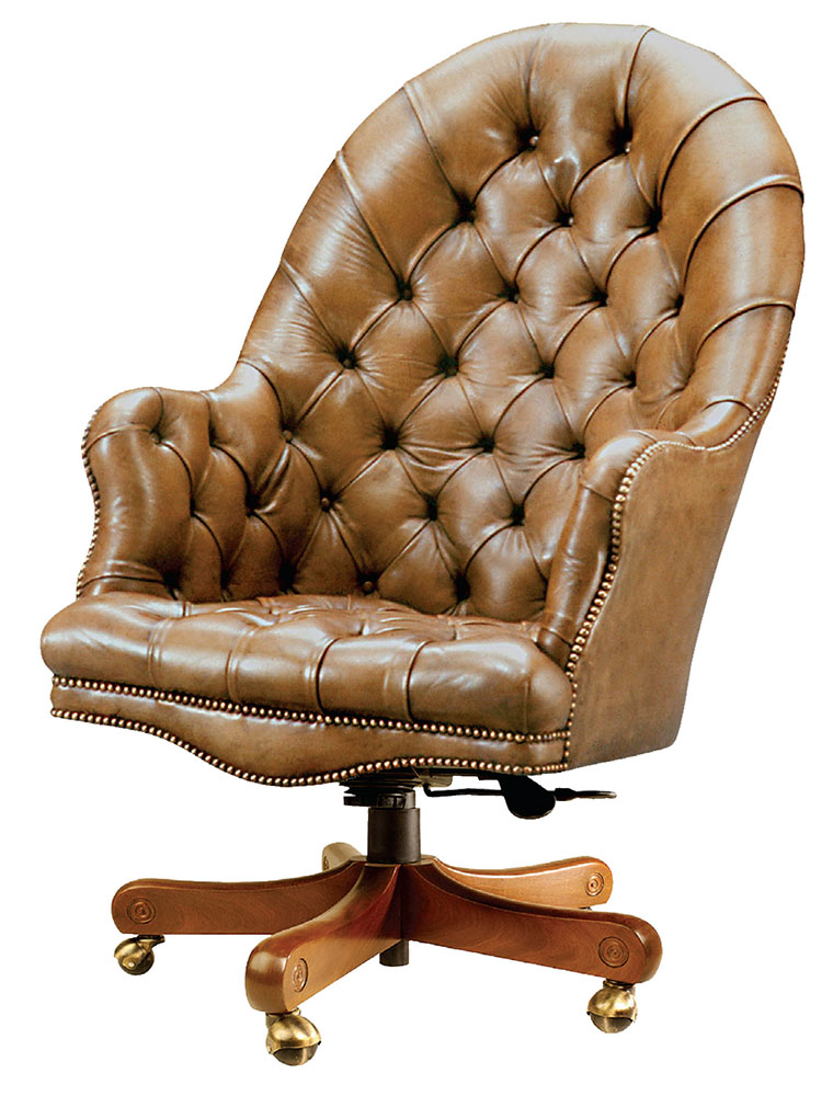 DESCRIPTION: Diamond tufted swivel chair leather cover receives full nail trim. KS3490 adjustable 5-star mahogany base has a height adjustment of 5”.