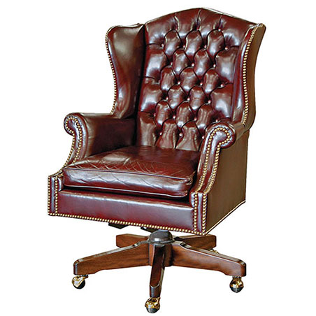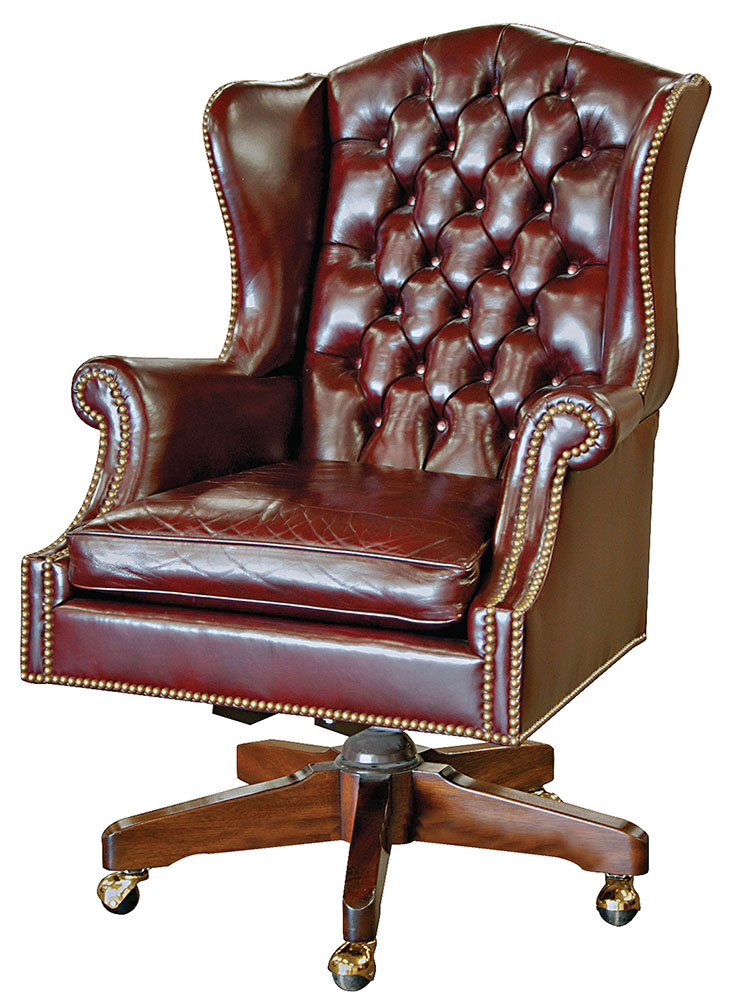DESCRIPTION: Diamond tufted swivel chair leather cover receives full nail trim. KS3490 adjustable 5-star mahogany base has a height adjustment of 5”.