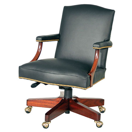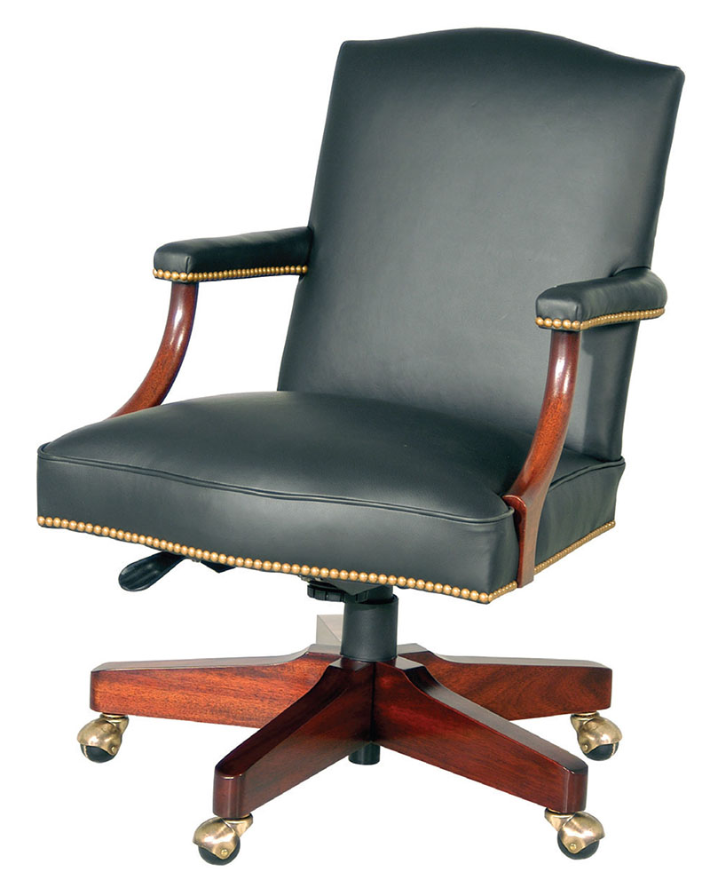 DESCRIPTION: Mahogany chair has tight back and seat, curved top rail and serpentine front seat rail. Available with optional full nail trim. KS3495 adjustable 5-star mahogany base has a height adjustment of 5”.