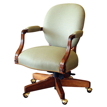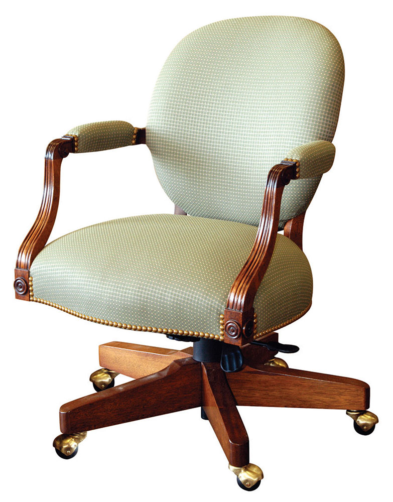 DESCRIPTION: Mahogany chair has tight back and seat, with carved and fluted arms. Available with optional full nail trim. KS3495 adjustable 5-star mahogany base has a height adjustment of 5”.