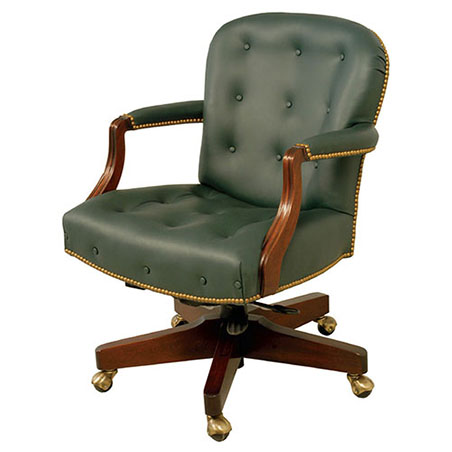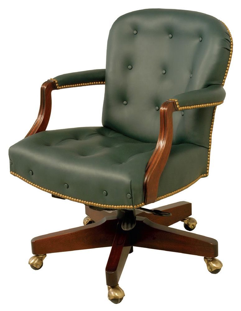 DESCRIPTION: Swivel chair has curved top rail and serpentine front seat rail. Available with optional full nail trim. KS3495 adjustable 5-star mahogany base has a height adjustment of 5”.