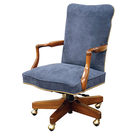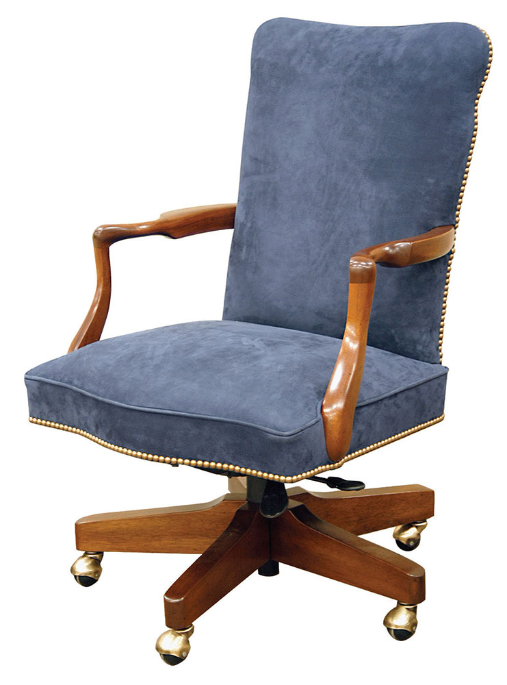 DESCRIPTION: Mahogany chair has tight seat, tight back and wood arms. Available with optional full nail trim. KS3495 adjustable 5-star mahogany base has a height adjustment of 5”.