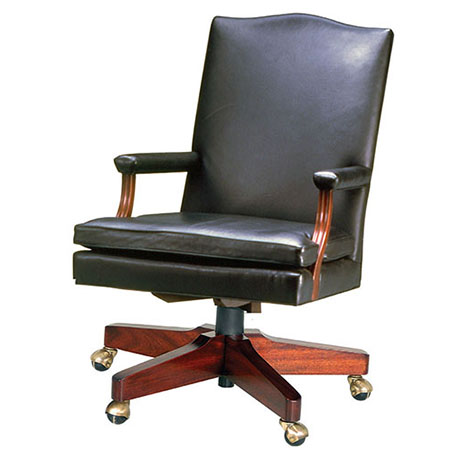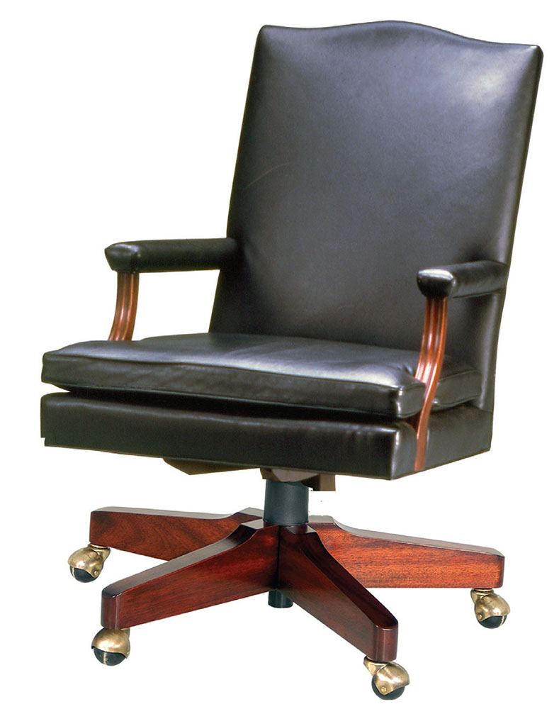 DESCRIPTION: Swivel chair has tight back, loose cushion and curved top rail. Available with optional full nail trim. KS3495 adjustable 5-star mahogany base has a height adjustment of 5”.