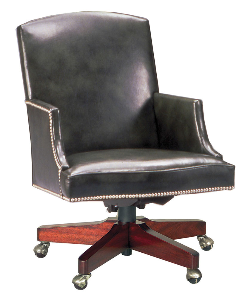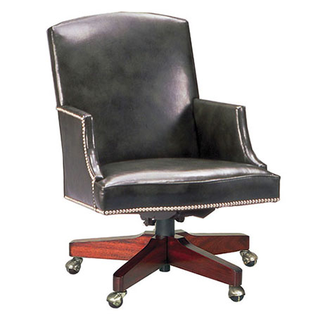 DESCRIPTION: Mahogany chair has closed upholstered arm, curved top rail.Available with optional full nail trim. KS3495 adjustable 5-star mahogany base has a height adjustment of 5”.
